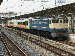 | ゆうサロ2両EF65牽引で到着(後ろはDE10) | 旅路、ゆうサロ、なにわ各2両で入線 | |